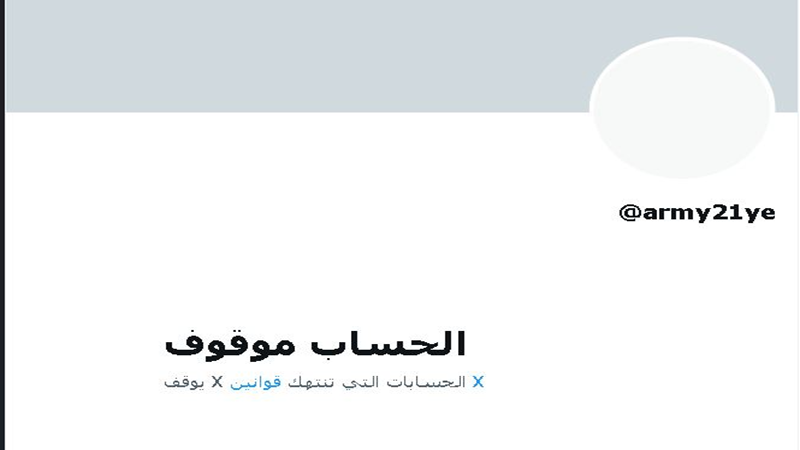 منصة إكس تقوم بإيقاف حساب العميد يحيى سريع .. وهذا هو حسابه الاحتياطي سيتم الاعتماد عليه مستقبلا حتى نحاول استعادة الحساب الرسمي.@army21yemen