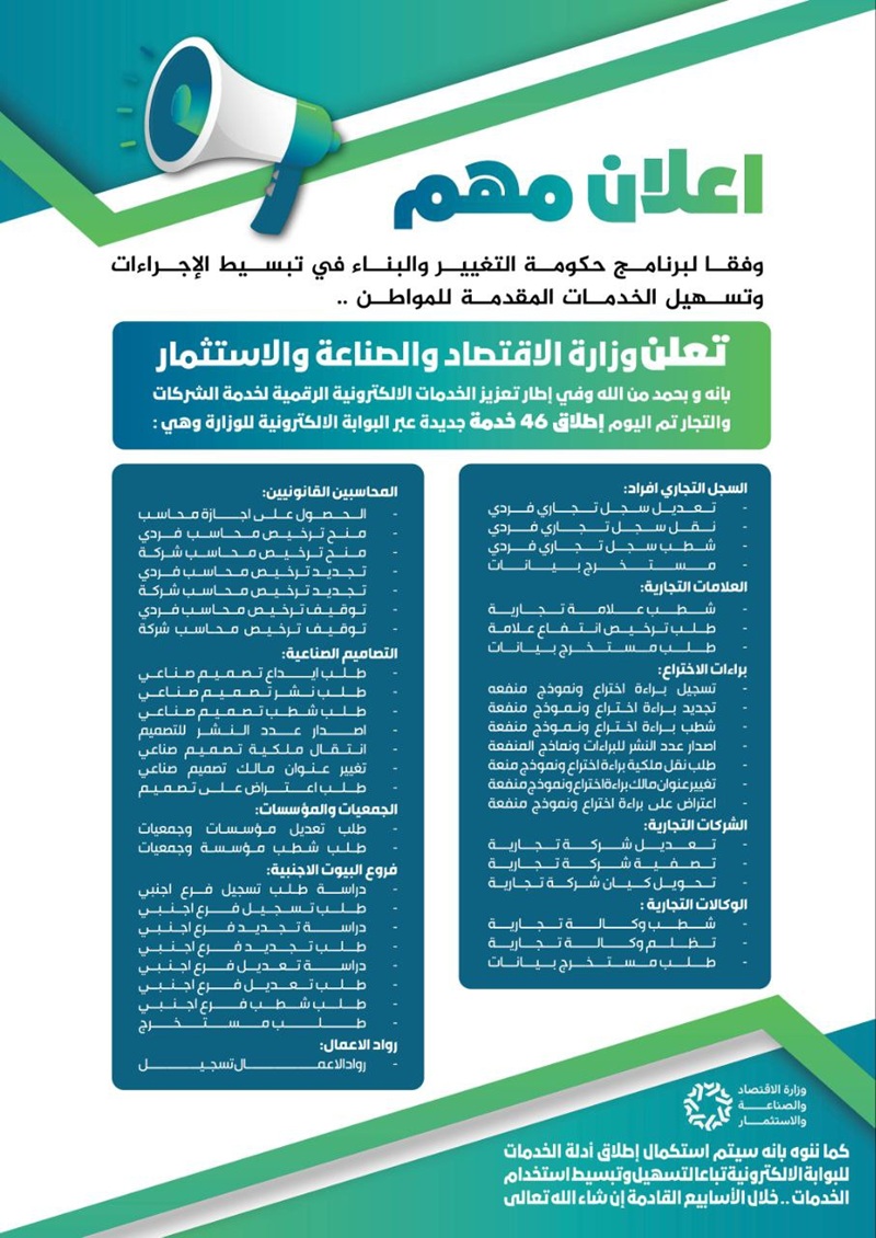 أعلنت وزارة الاقتصاد والصناعة والاستثمار اليوم، عن إطلاق 46 خدمة جديدة عبر البوابة الإلكترونية للوزارة بعد استكمال تجارب الاستخدام التجريبي للخدمات الجديدة.