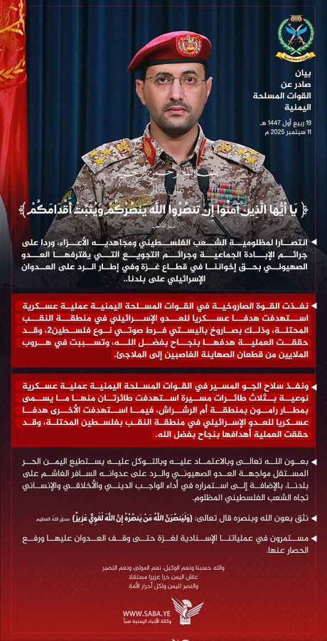 — العميد يحيى سريع (@army21yemen) September 11, 2025