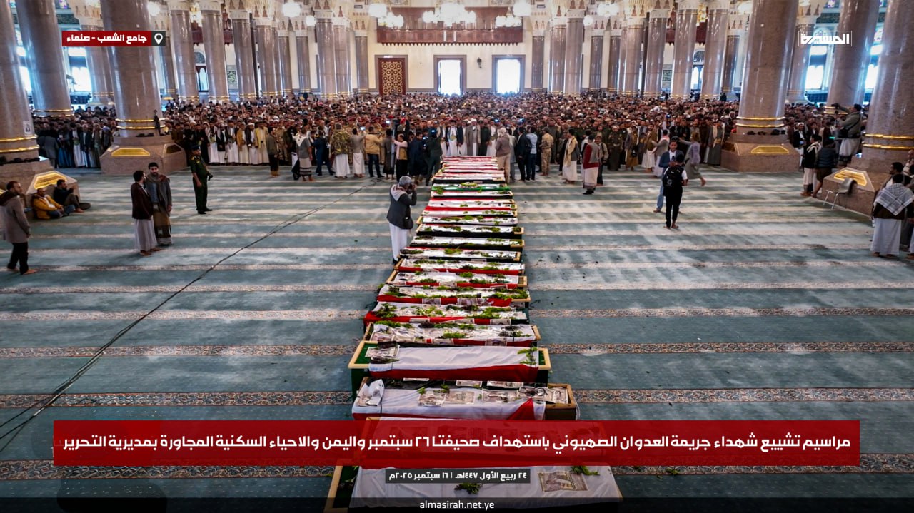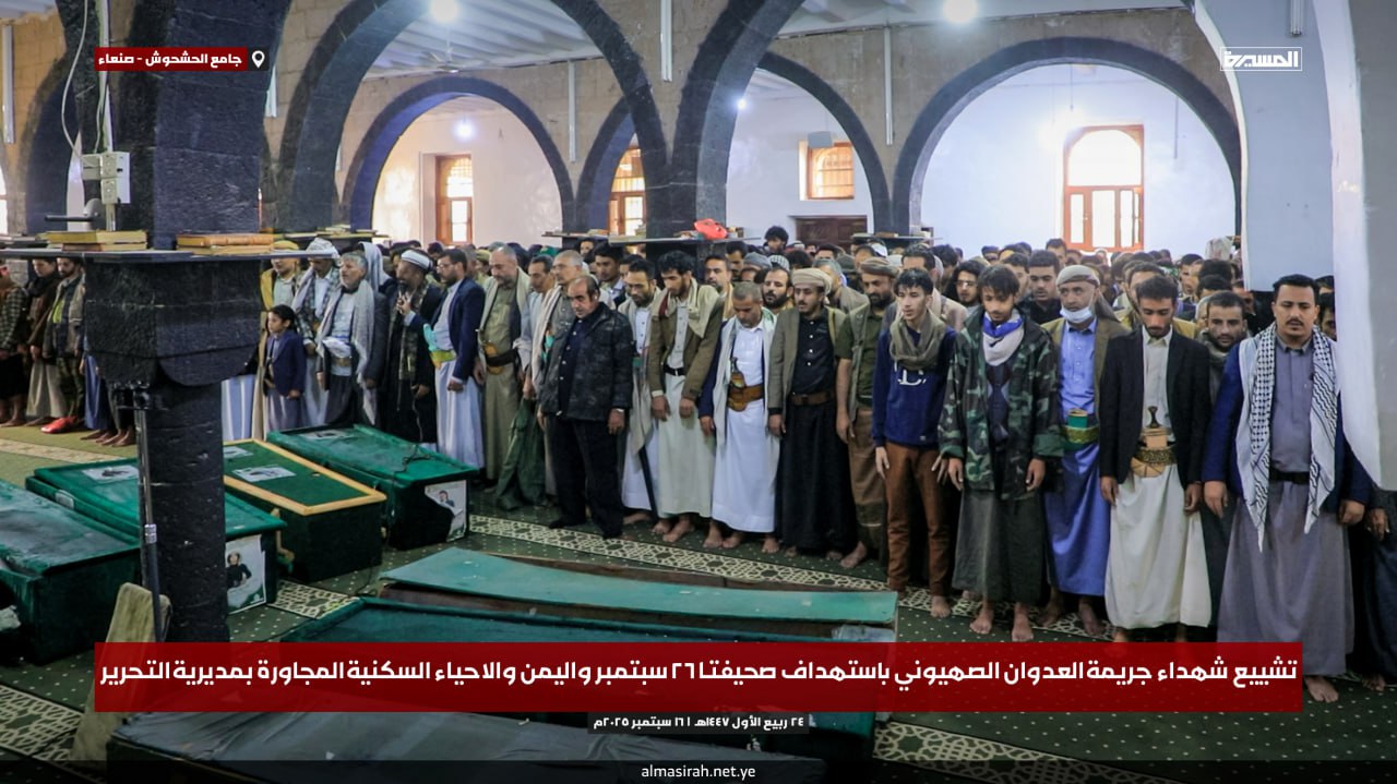 بالصور | تشييع شهداء جريمة العدوان الصهيوني باستهداف صحيفتا 26 سبتمبر واليمن والأحياء السكنية المجاورة في حي التحرير بالعاصمة بصنعاء