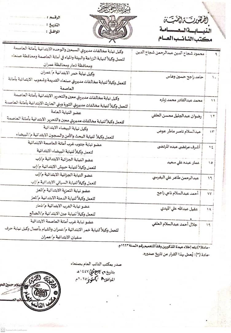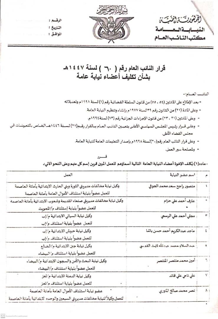 أصدر النائب العام القاضي عبدالسلام حسن الحوثي القرار رقم (60) لسنة 1447هـ، بشأن تكليف عدد من أعضاء النيابة العامة في أمانة العاصمة وعدد من المحافظات، وذلك على النحو الآتي: