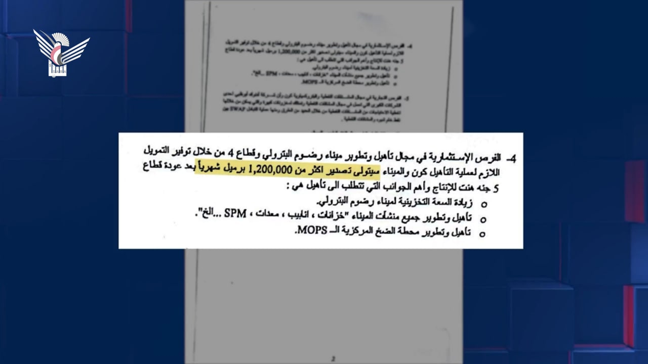 الوثائق ذاتها كشفت أيضا عن محاضر بين جهات تابعة لوزارة النفط بحكومة المرتزقة وشركة "أدنوك" الإماراتية عن توقعات بمضاعفة الصادرات النفطية من خام شبوة ومأرب إلى مليون و200 ألف برميل شهريا.