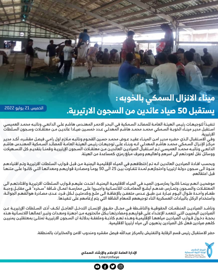 وصل الى محافظة الحديدة اليوم  50 صيادا يمنيا بعد الافراج عنهم من قبل  السلطات الاريترية ومصادرة قواربهم ومعدات الاصطياد الخاصة بهم  .